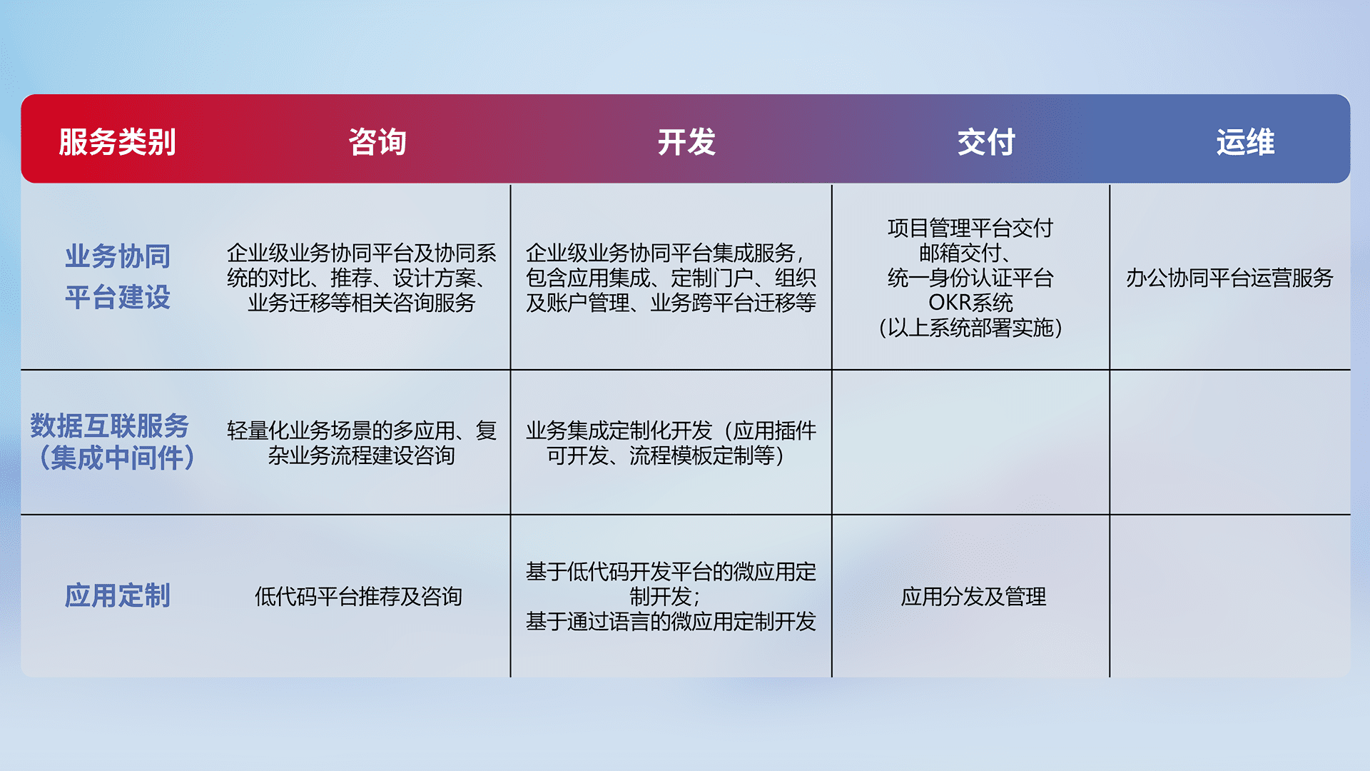 针对钉钉、、、企微、、、、IDaas等平台级产品提供产品的规划、、方案、、、、交付、、定制化开发等服务,,实现如统一协同办公、、、、智能客户服务、、、混合会议管理、、智能数据查询、、、等业务场景,,实现数字化转型。。。